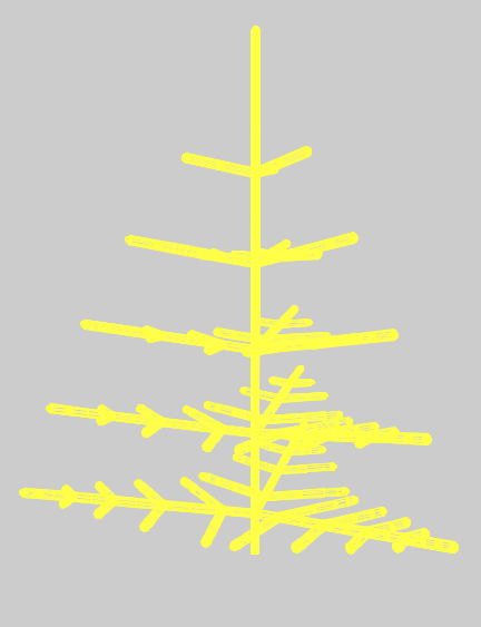 which,after 3 iterations, produces the “plant” below by drawing a shoot, moving back half the length rotation 30 degrees around the y axis and than starting over again two times.