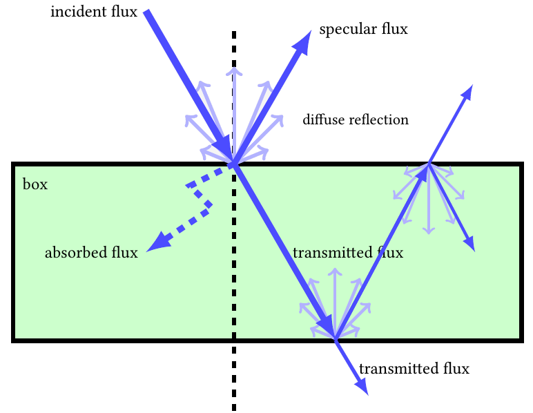 Note: The implementation basically allows to set individual limits for min and maxLambda extending the range of the visible light spectrum, i.e. infra-red and ultra violet. When the wavelength deviates too much from visual light, ray optics is no longer the most adequate tool for describing flow of electromagnetic radiation as other effects become quite significant. Therefore, from a physical point of view, the results will become not meaningful any more. One reason for this choice - the default range of 380-72nm - is that the model uses smith's conversion from RGB colours to full spectra. This conversion assumes that the whole spectrum is somehow covered by the RGB colour, thus restricting the spectrum to the visual range. But if your model only uses spectral colours as inputs then the interval could safely be extended.