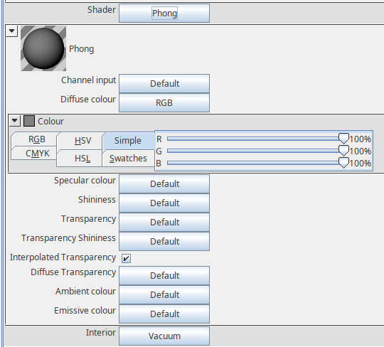 // mirror static Phong mirrorShader = new Phong(); static { mirrorShader.setDiffuse(new RGBColor(0.0, 0.0, 0.0)); // should work with black and white as base colour mirrorShader.setSpecular(new Graytone(1)); mirrorShader.setShininess(new Graytone(1)); } // glass static Phong glassShader = new Phong(); static { glassShader.setDiffuse(new RGBColor(1.0, 1.0, 1.0)); // base colour white glassShader.setDiffuseTransparency(new Graytone(0.97)); // 97% transparent glassShader.setSpecular(new Graytone(0.5)); glassShader.setShininess(new Graytone(0.5)); } // semi-transparent static Phong semiTransparentShader = new Phong(); static { semiTransparentShader.setDiffuse(new Graytone(1,0)); // base colour white semiTransparentShader.setDiffuseTransparency(new Graytone(0.5)); // 50% transparent } // total absorber (pure black, reflecting nothing) static Phong absorberShader = new Phong(); static { absorberShader.setDiffuse(new Graytone(0..0)); } // red reflector (only reflecting red) static Phong redShader = new Phong(); static { redShader.setDiffuse(new RGBColor(1.0, 0.0, 0.0)); }
