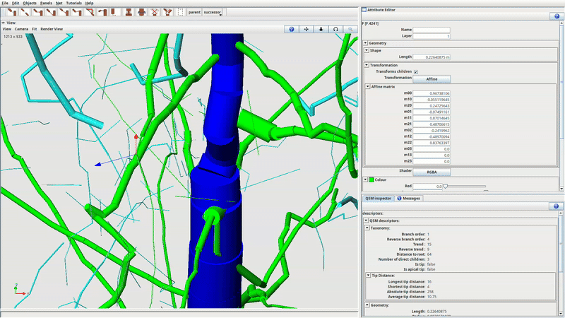 Finally lets select one of the cylinders. This will display its descriptors in the QSM inspector (lower right corner) as well as the available functions in the toolbar (above the 3d view).