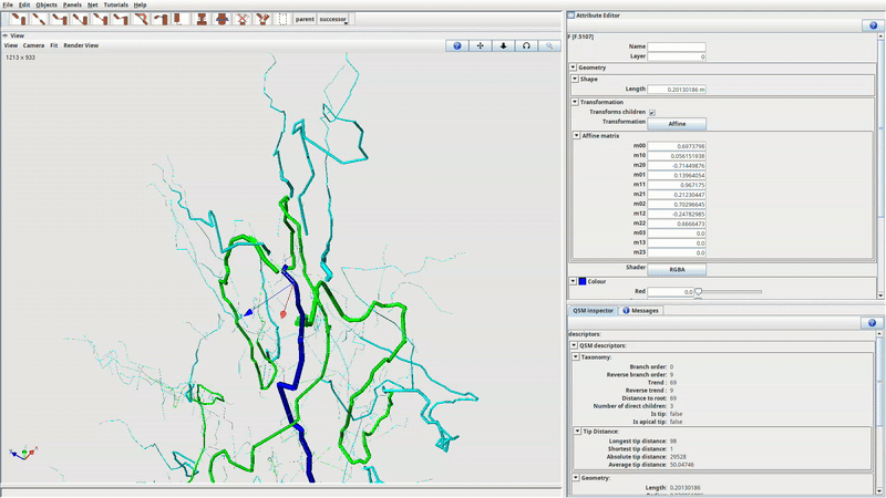 Finally lets select one of the cylinders. This will display its descriptors in the QSM inspector (lower right corner) as well as the available functions in the toolbar (above the 3d view).