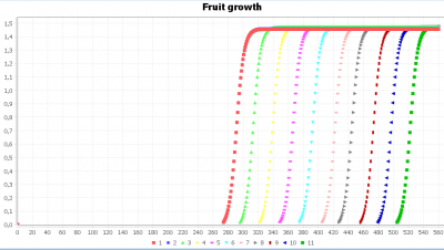 In order to see the development in time of each fruit, we have created a graph “Fruit growth. Here is how the associated data table (fruitdata) is filled: