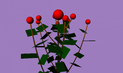 module Internode(super.length, int age, int rank, float as) extends Cylinder(length, 0.1); module Leaf(super.length, super.width, float al, int age, float as, int rank) extends Box(length, width, 0.01); module Fruit(float size, int age, float as) ==> Sphere(size).(setShader(RED));
