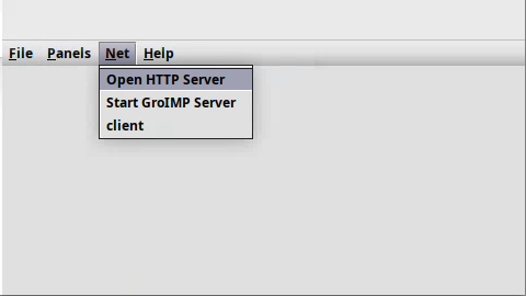 In the main GroIMP menu under the section Net, the entry Open HTTP Server can be found. This will lead to a popup requesting the port number of the server (for more information about the port see below). After a port was given (usually the default one is fine) a new workbench with only the Messages panel is opened. The server now runs until this workbench is closed.