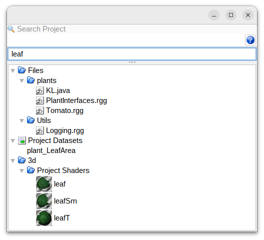 The project wide search panel can be found under “Panels/search Project”. It can be used by tying in the text input and trigger the search by pressing enter. The search process filters all resources of a project based on the name and additionally the file based on the content.